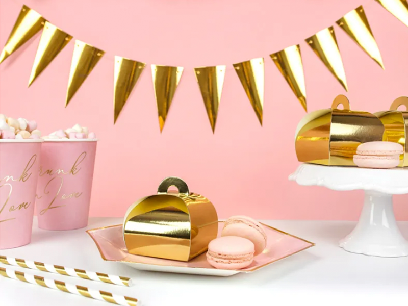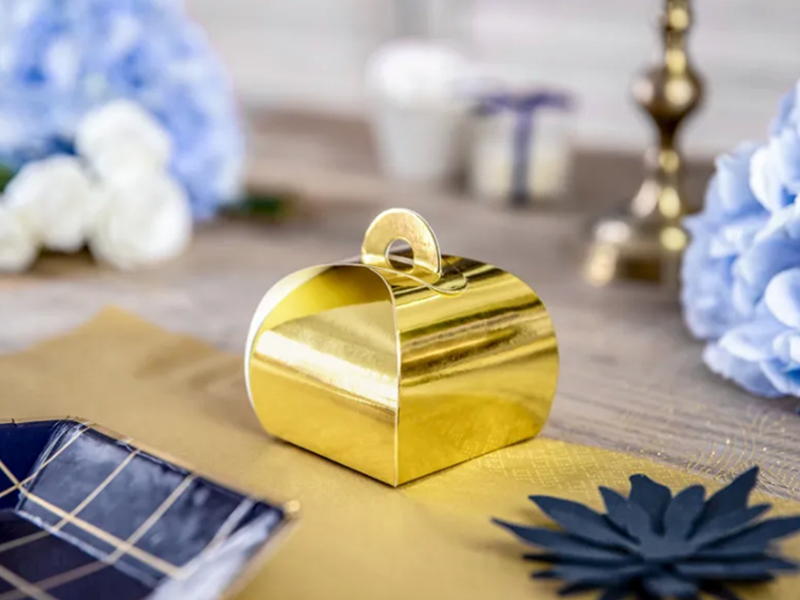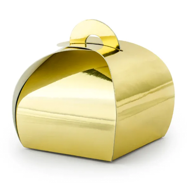 Mini Caixas com alça na cor dourado gold, 6x6x5,5cm - Caixas feitas de papel dourado espelhado.